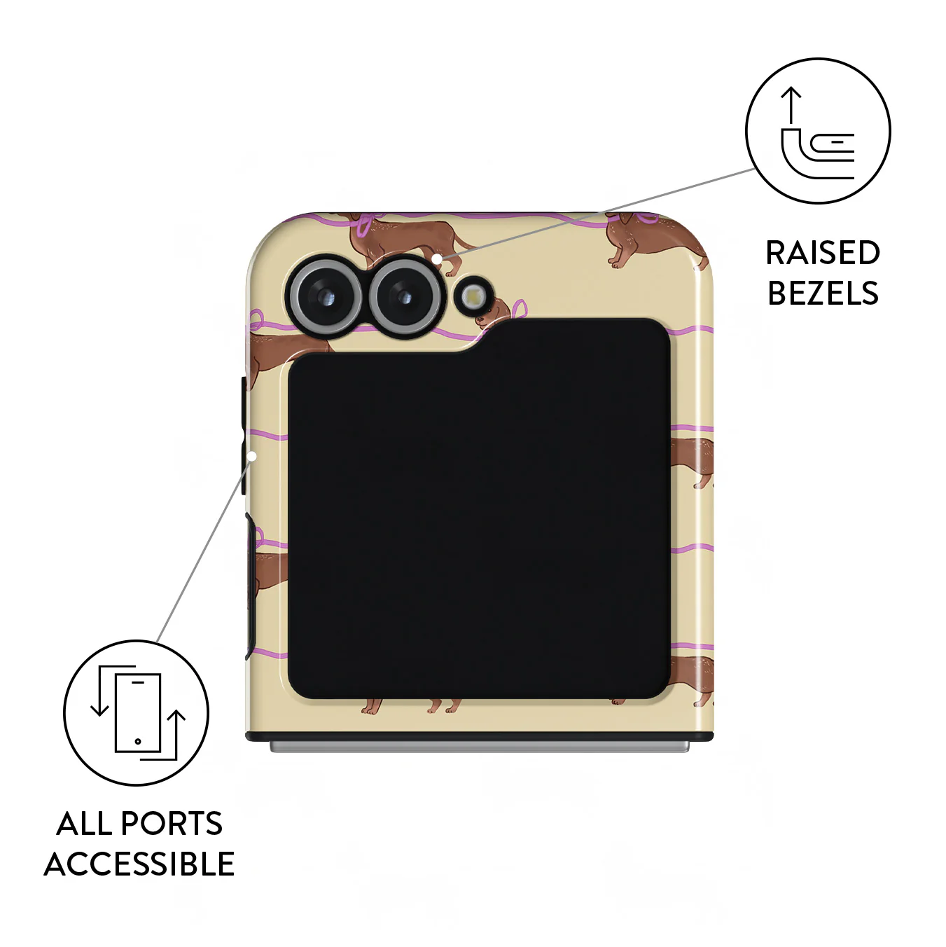 This Samsung Galaxy Z Flip 7 FE phone case design doesn’t believe in time, only vibes. It features sassy sausage dogs with bows who, like you, are running 15 minutes behind—and blaming Mercury.