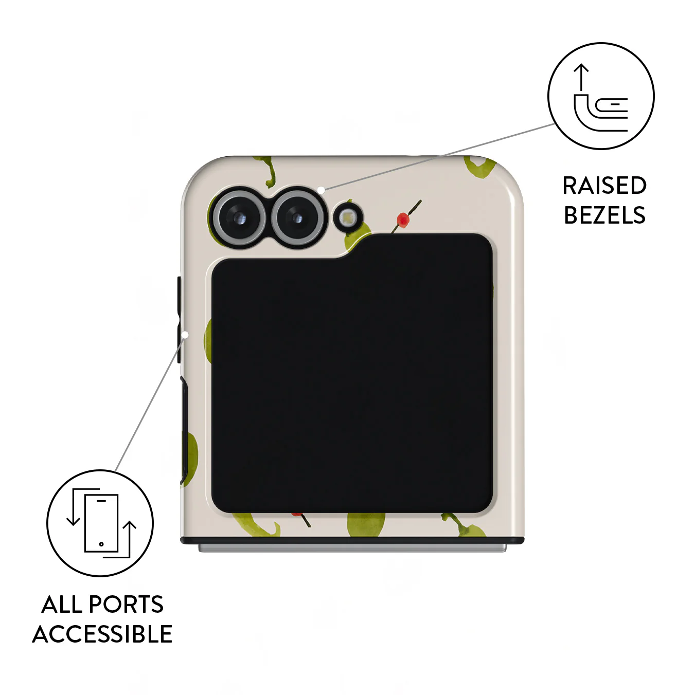 This Samsung Galaxy Z Flip 7 FE Case phone case design is olives, peppers, and just the right amount of āshould I flirt with the waiter or not?ā vibes. Itās sunburned shoulders, cold drinks, and that āIām living my best lifeā energy all rolled into one. This design features: olives, peppers, Mediterranean pattern