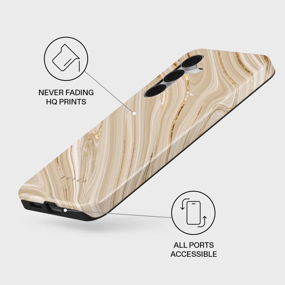 The Full Glam Samsung Galaxy S25 FE phone case exudes elegance and softness in the beige color scheme with golden accents. The delicate design of the phone case will enhance your style and keep your phone safe and sound while doing that.