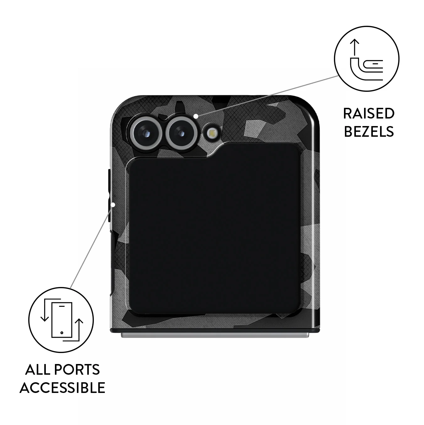 Sometimes, all you need is a possibility to blend into nature. With our Night Black Camo Samsung Galaxy Z Flip 7 FE phone case, use black camouflage as a way to express your curious side or blend in with the surroundings. A stylish accessory can offer heavy-duty protection too!