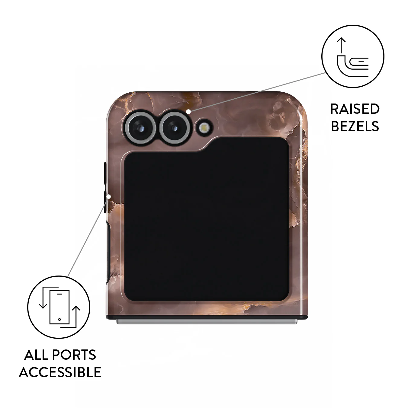The bonfire starts to flicker – it's time to gather more wood. With a brown marble Samsung Galaxy Z Flip 7 FE phone case design inspired by a bonfire flame, carry a feeling of content and excitement wherever you go. The protective case is needed in a hike, but a stylish accessory will match your aesthetic even on a lazy Sunday.