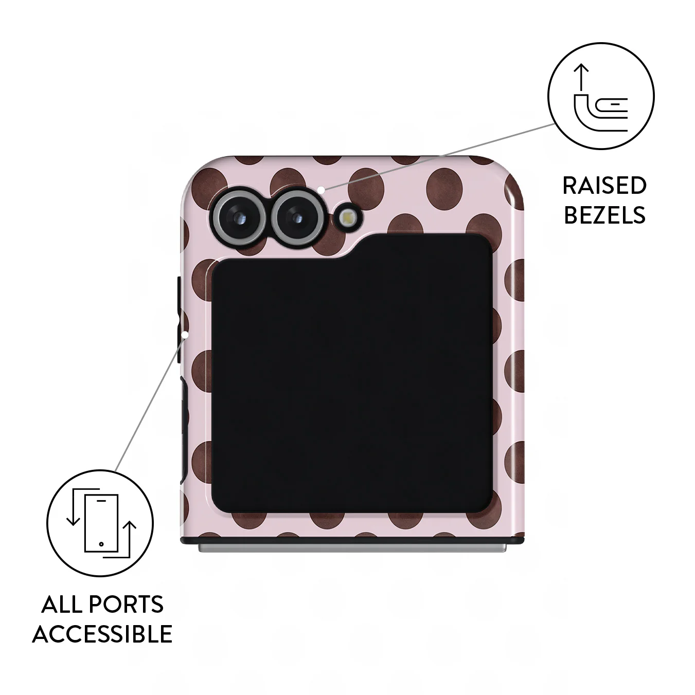 This design features: a retro polka dot pattern, pink background with brown polka dots.