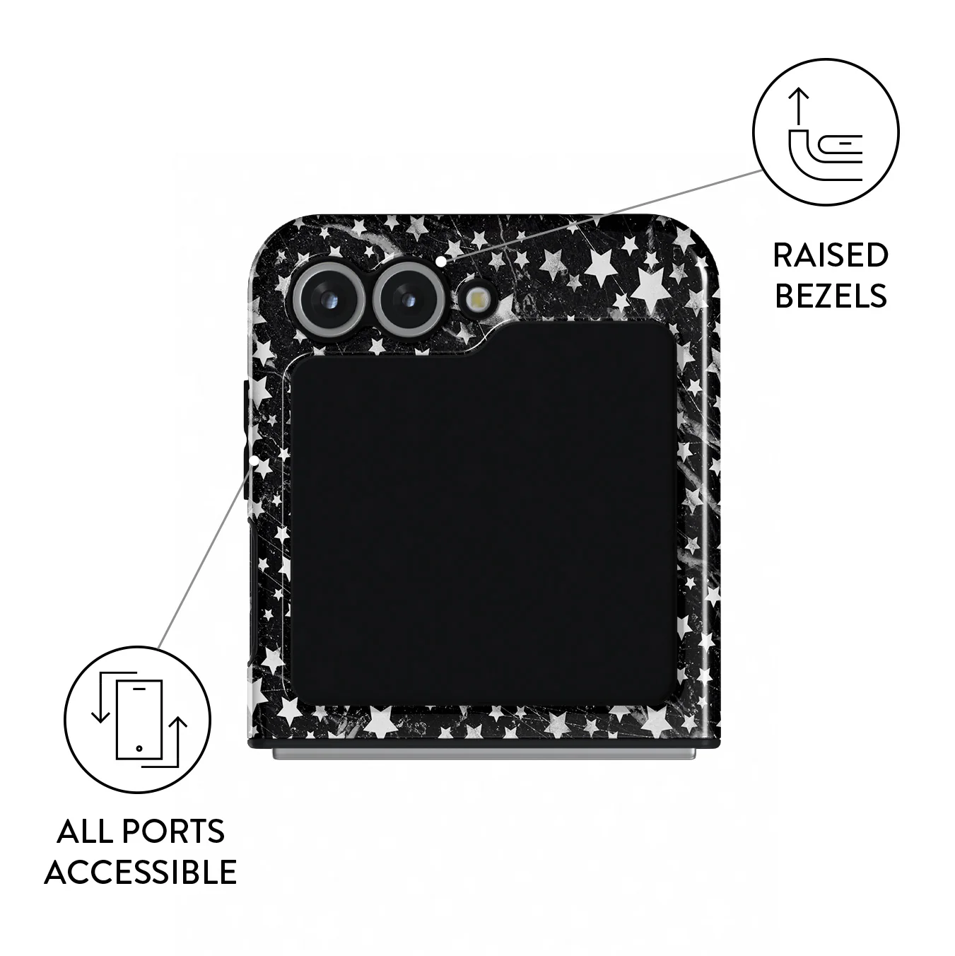 Samsung Galaxy Z Flip 7 FE phone case is inspired by the sky above us. Here the charming star pattern meets with a trendy black and white marble. Add the unique combination to your wardrobe and transform your protective phone case into a fashion accessory.